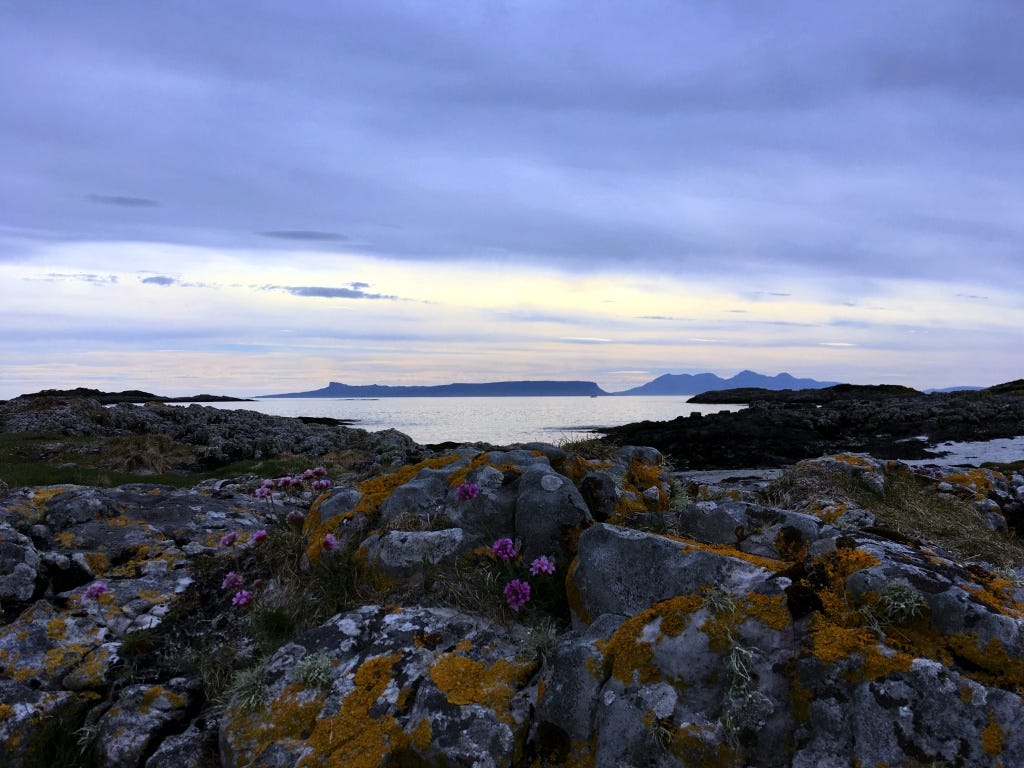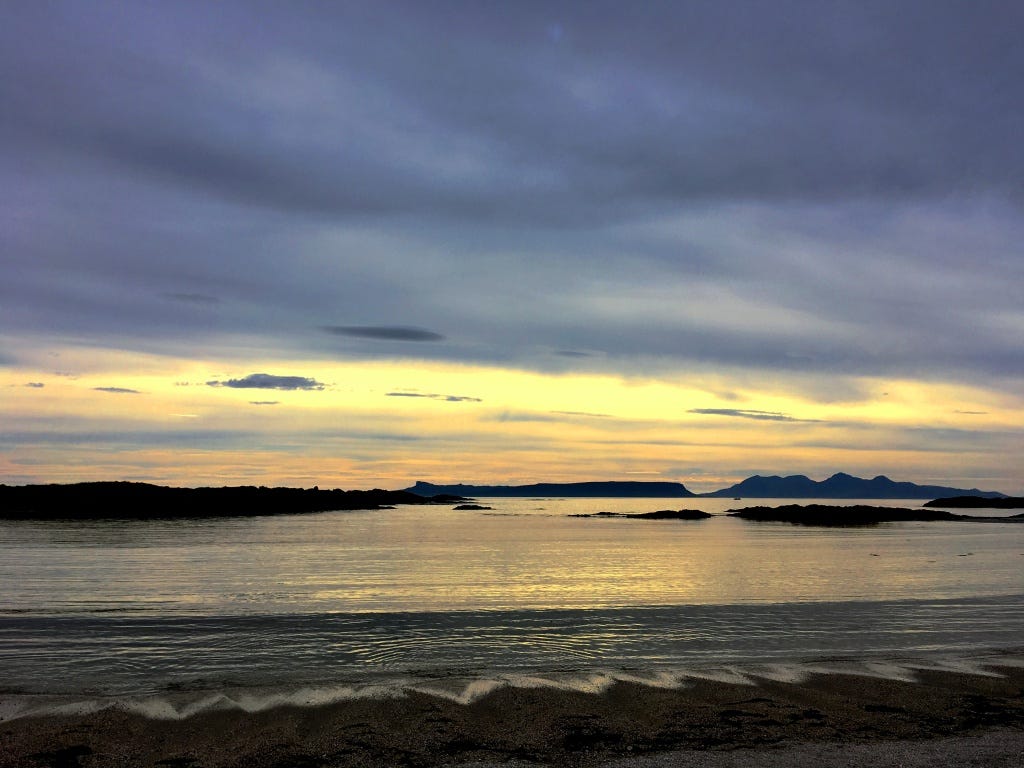 Patch-work lichen Veiled in twilight. Wind-forged shadow-peaks of The Small Isles, of the sea-wrapped rocky islets. We skim stones at Àrasaig, Pebbles tumble, in clumsy fingers. Such turbid ripples, of crumbled knuckle-dust, of old Viking bones, rumbling a timeless, tired mumbling. In this quiet blanket of peace The mind, murmurs and mutters. Stay for a while In this Kingdom of Isles.