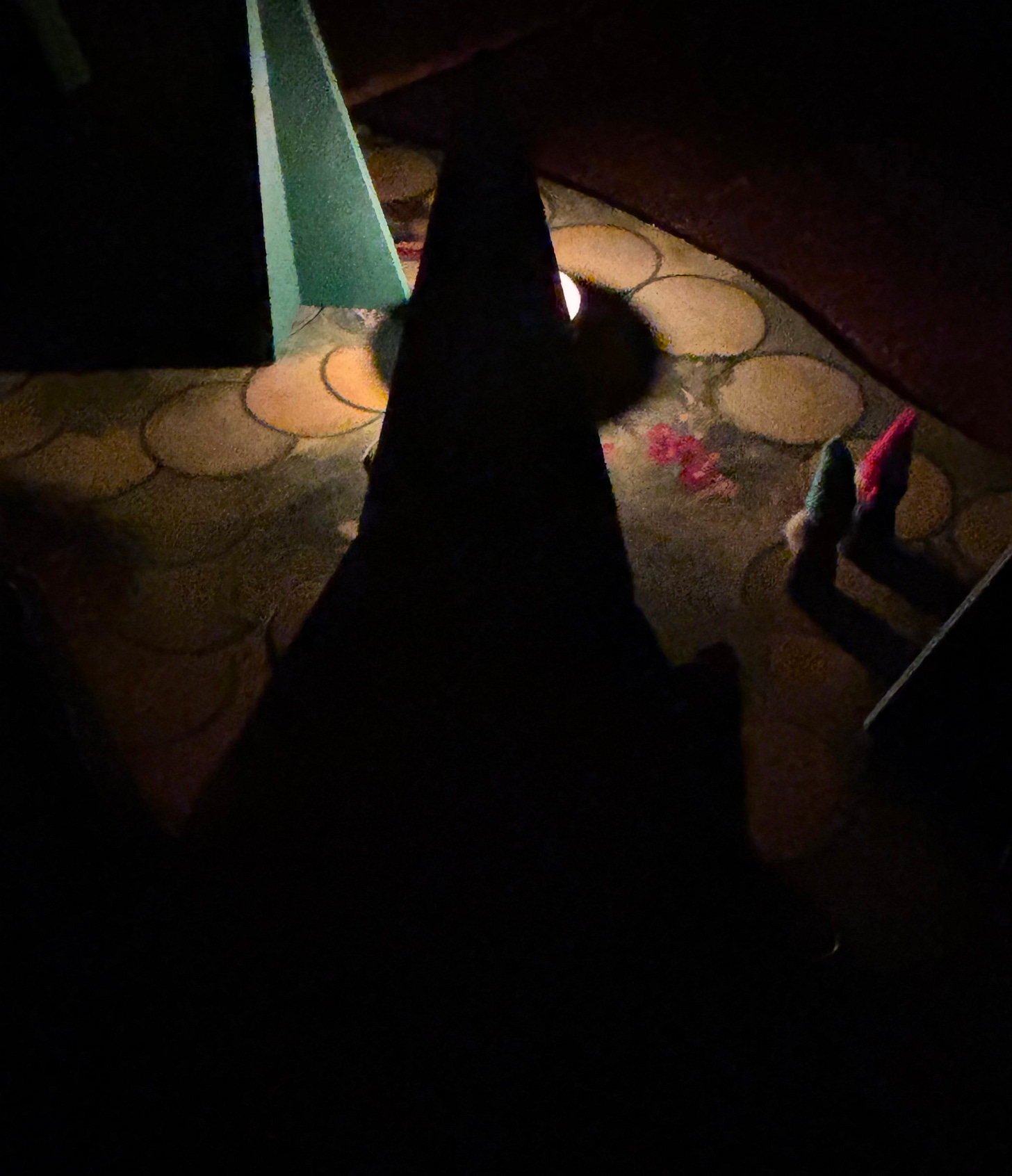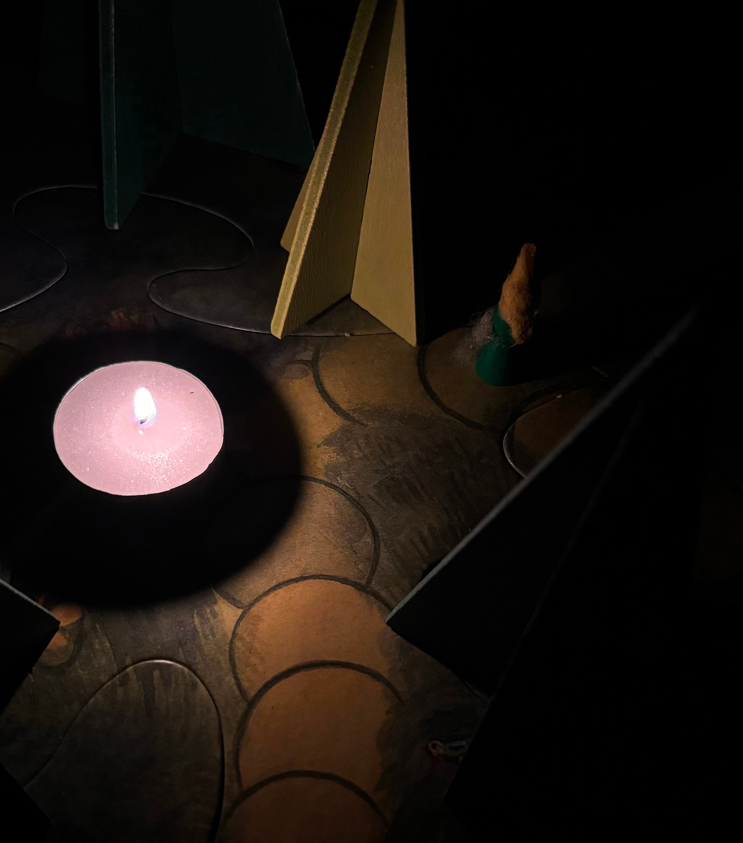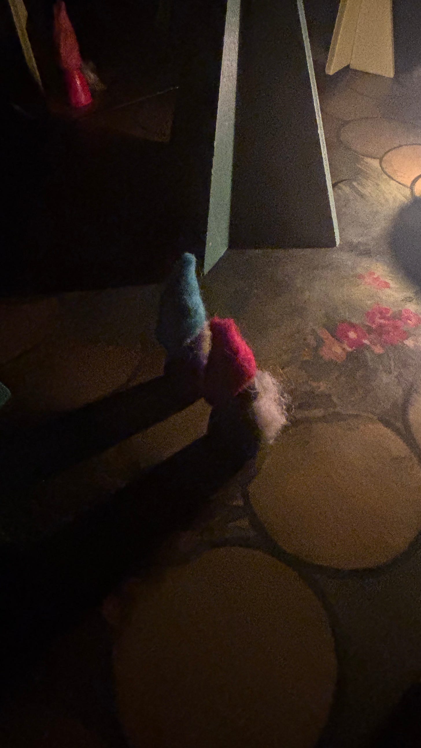 Complete darkness works best, and in this shadowy world, the trees also cast their shadows on the walls, so if you can preserve a childlike wonder, you too are in the shadowy forest. Part of the realisation for the children is that they can hide their dwarves in sight right in front of the light-bearer in what feels like should surely be visible - yet if the candle is in the right position beyond the tree, the adult won't be able to see them. The effect of being hidden yet in front of you, in complete darkness, is quite magical. The light-bearer can't move from their seat and must close their eyes during the dwarves’ movements. You rely utterly on the tiny light to catch a glimpse of a hat or beard. It's difficult to find the dwarves, much to the amusement of young children.