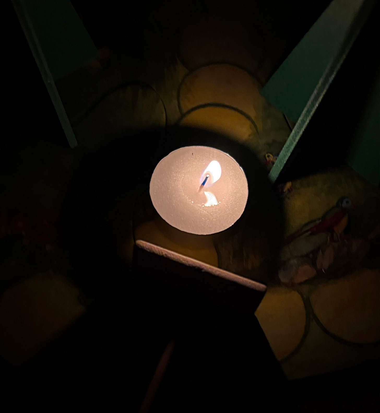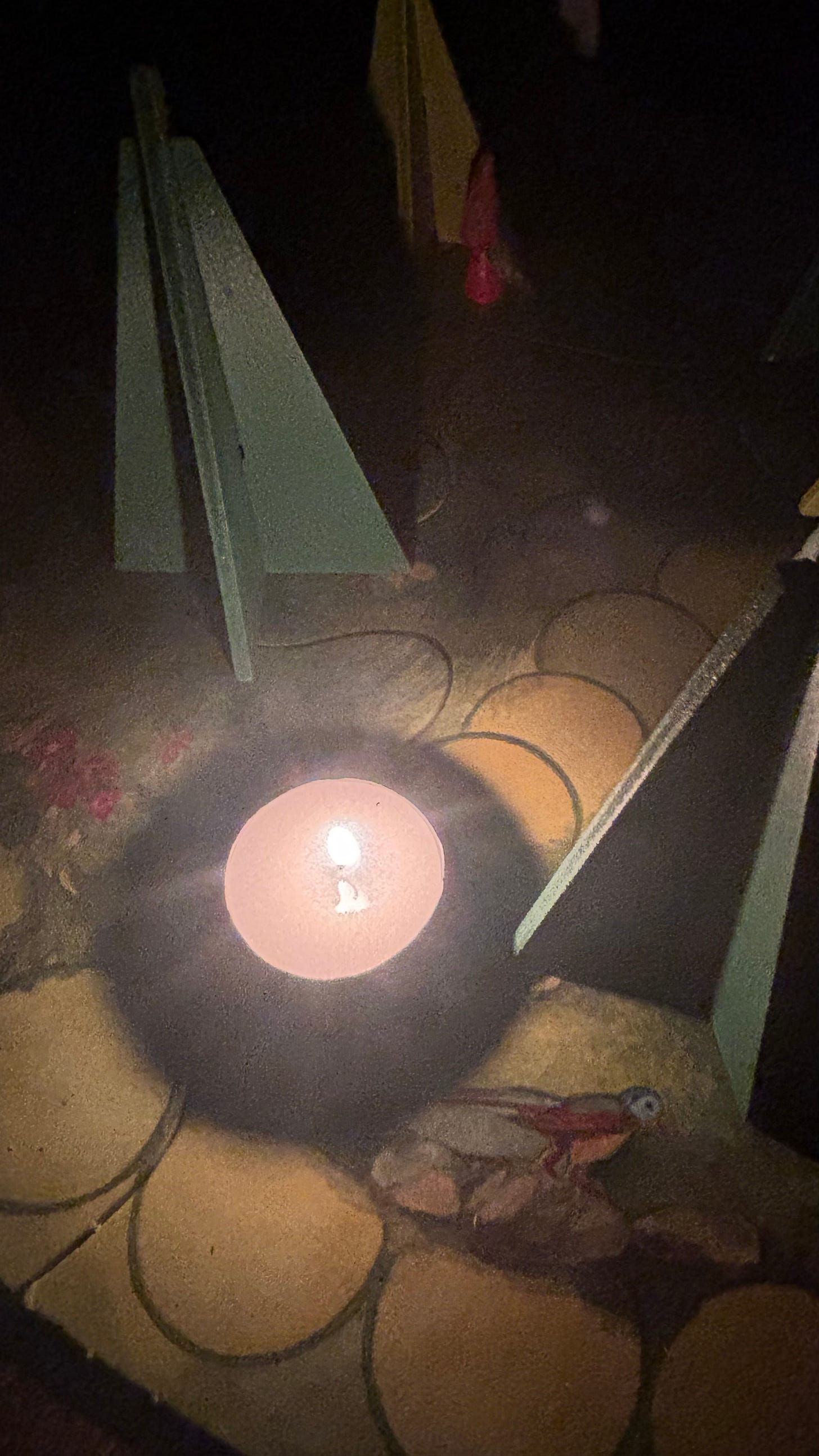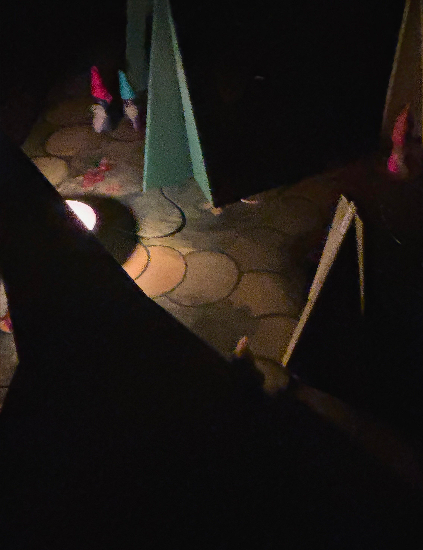 Complete darkness works best, and in this shadowy world, the trees also cast their shadows on the walls, so if you can preserve a childlike wonder, you too are in the shadowy forest. Part of the realisation for the children is that they can hide their dwarves in sight right in front of the light-bearer in what feels like should surely be visible - yet if the candle is in the right position beyond the tree, the adult won't be able to see them. The effect of being hidden yet in front of you, in complete darkness, is quite magical. The light-bearer can't move from their seat and must close their eyes during the dwarves’ movements. You rely utterly on the tiny light to catch a glimpse of a hat or beard. It's difficult to find the dwarves, much to the amusement of young children.
